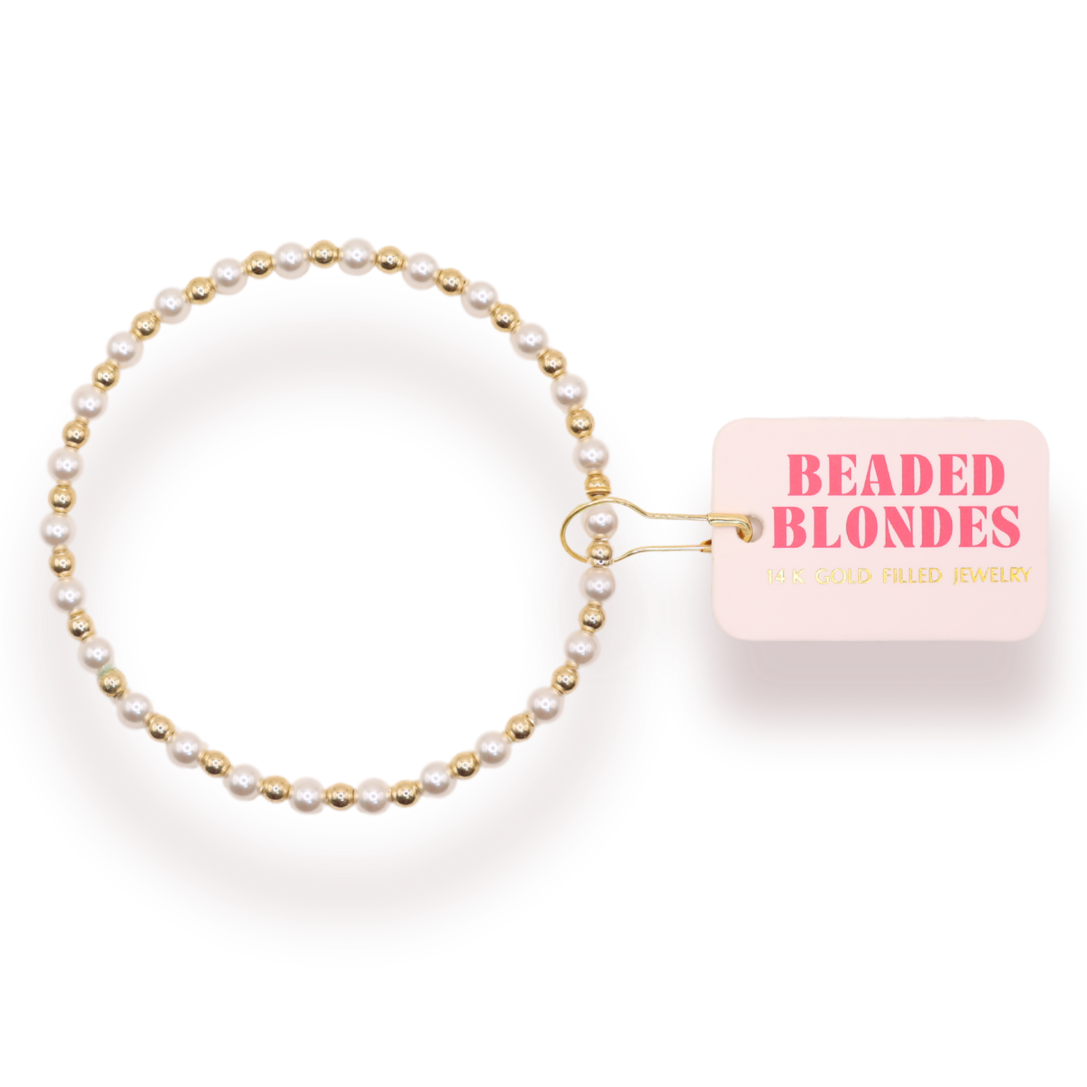 The Luci bracelet is 3mm beads + synthetic pearls.