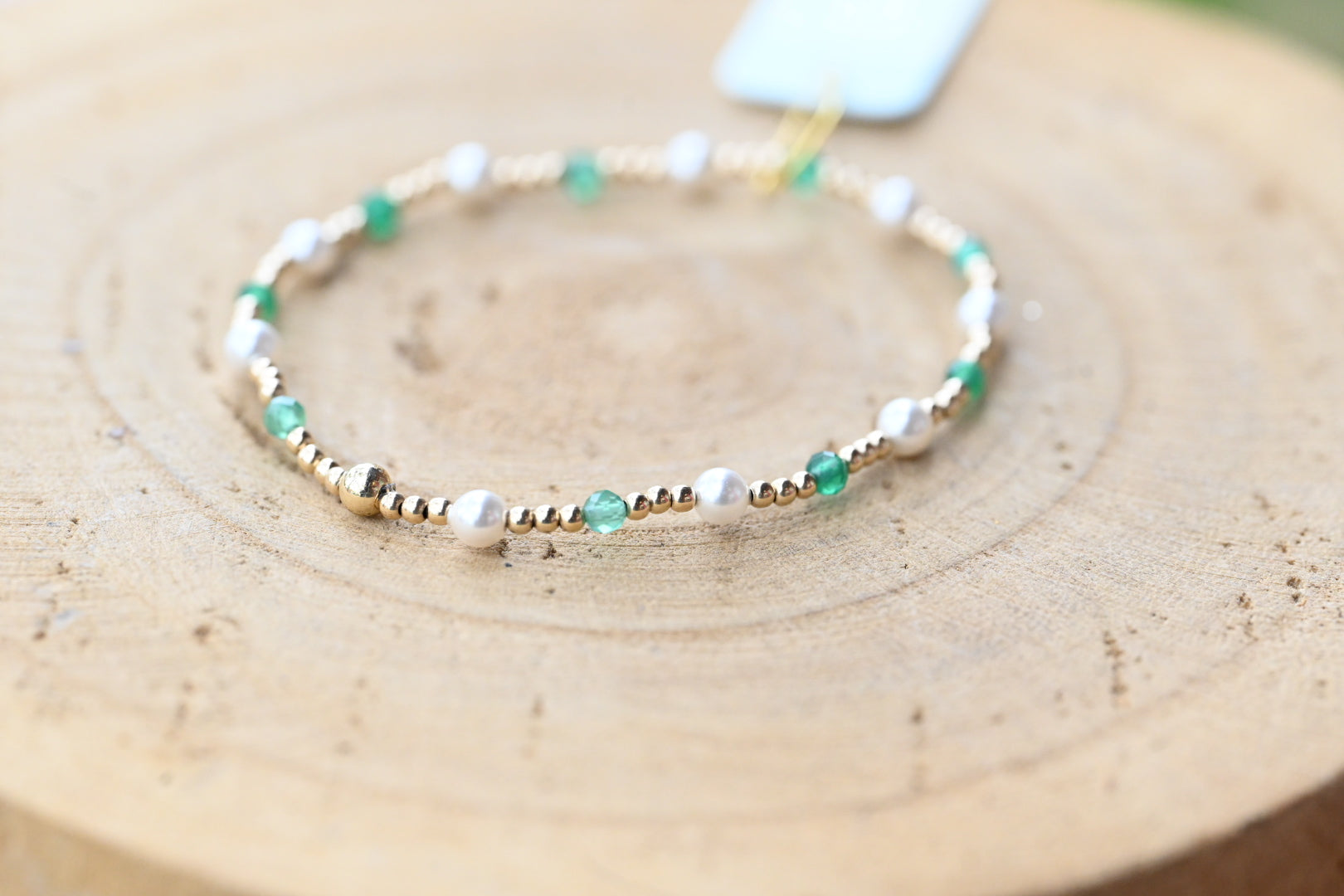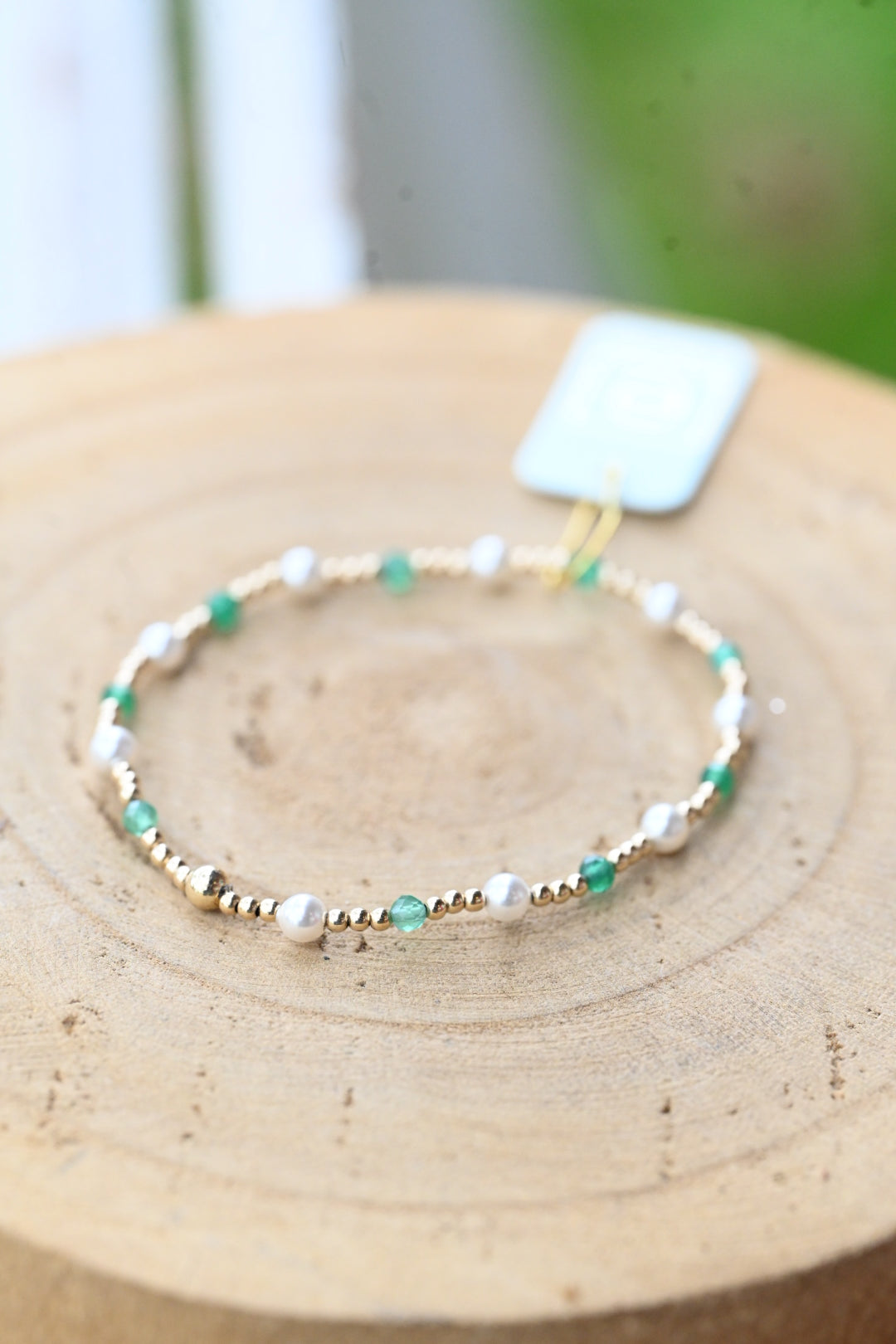 You will fall in love with this classic gold sincerity pattern 4mm bead bracelet with pearl and gemstone.