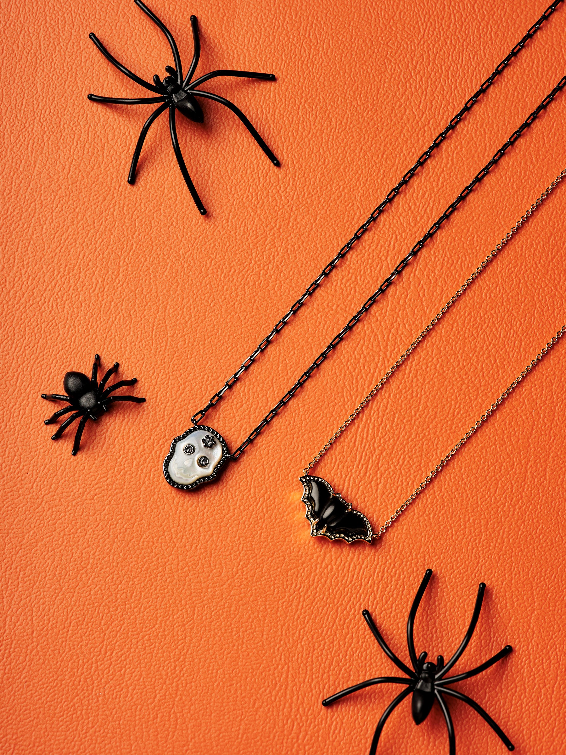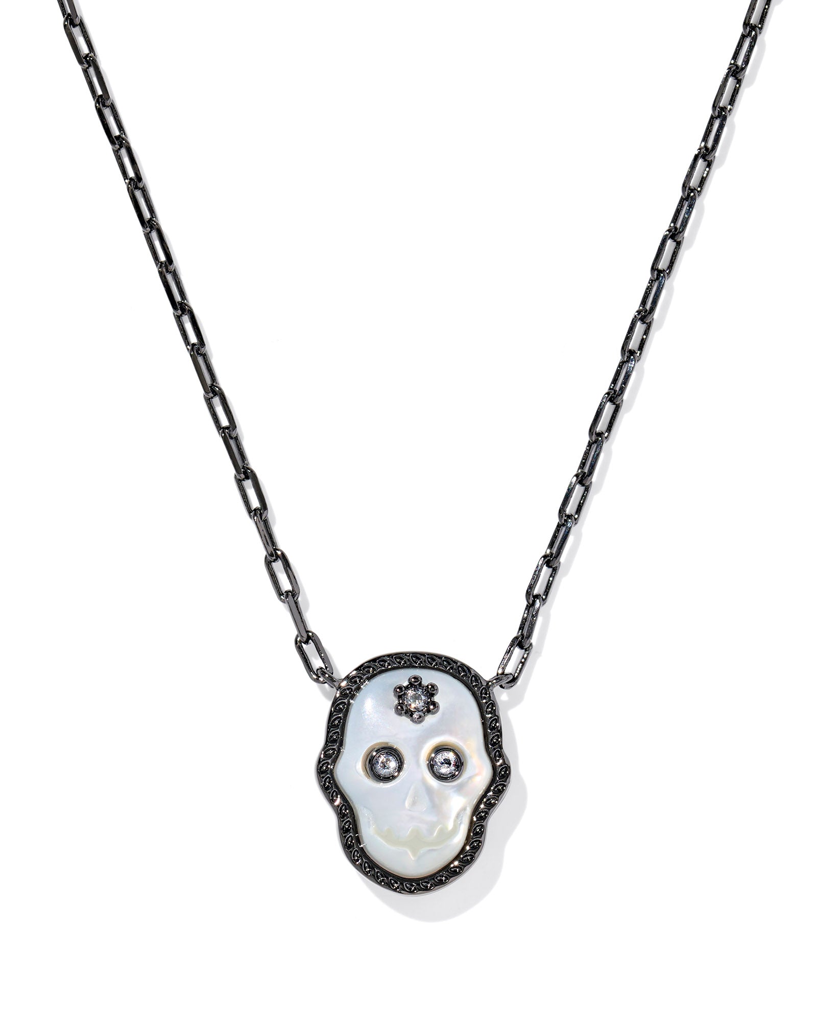 Frighteningly fashionable, the Skeleton Gunmetal Short Pendant Necklace will put the spirit in your Halloween fits. A shimmering mother-of-pearl skull is framed by our signature hoofprint detailing, creating a seasonal style that’s so KS, it’s spooky.