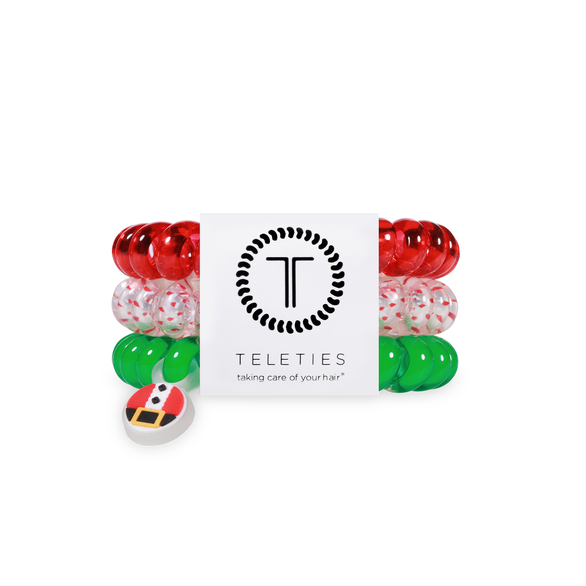 Secret Santa Large Hair Ties in Red, Green, and Clear offer a strong grip without damage, doubling as a chic wrist accessory when not in use. Your new favorite hair essentials all year round.
