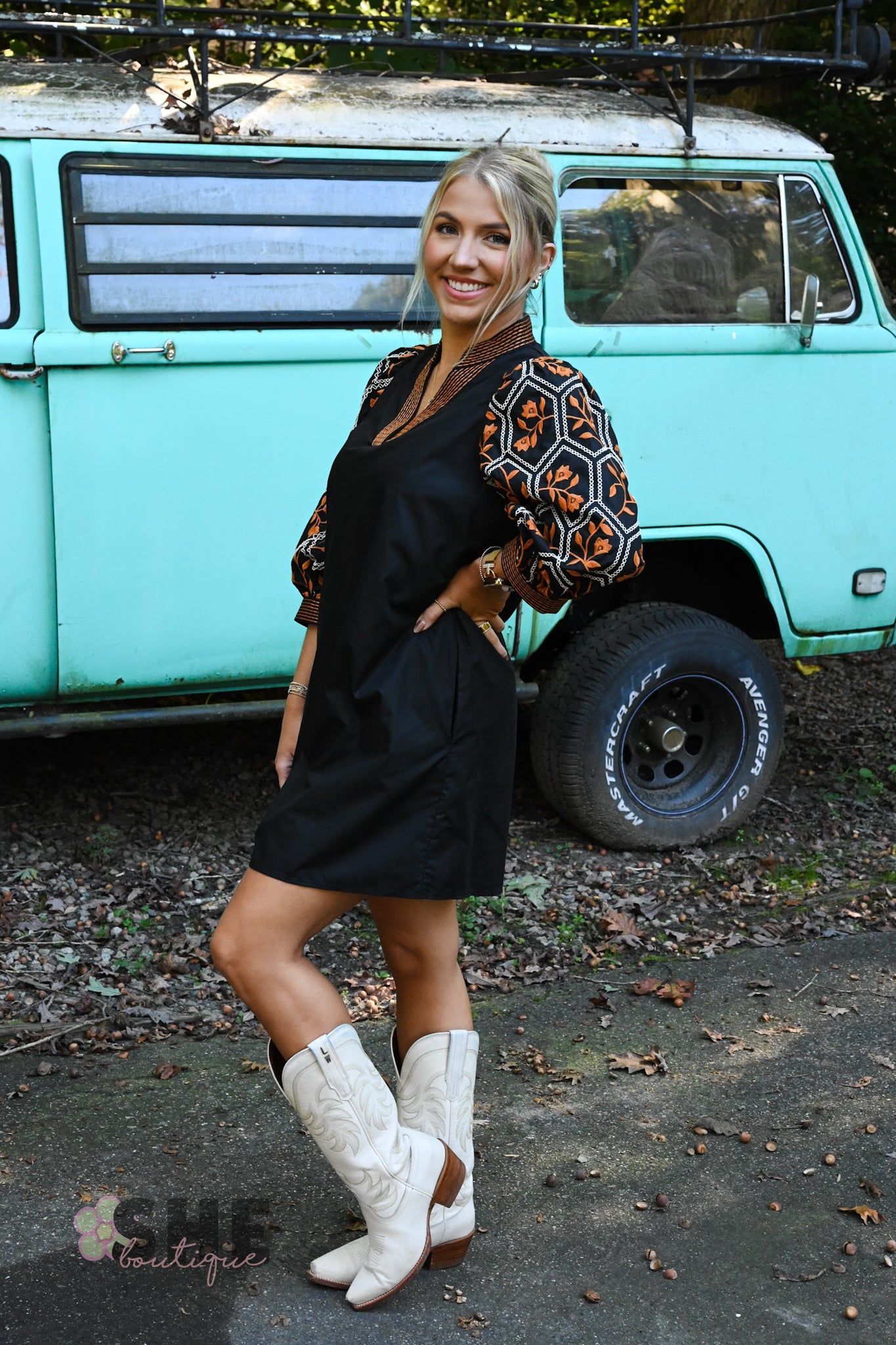 Solid 3/4 sleeve mini dress featuring textured jacquard sleeve with contrast knit neck and cuffs. Stitch detail at collar and sleeve opening. Side pockets. Lined. Woven. Non-sheer. Lightweight.